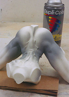 First, test fit the legs. It's key that the legs be precisely placed so that both lay flat, i.e. both knees and toes should be touching the same level surface. Place two thicknesses of corrogated cardboard under her breasts. (This is the height the breasts will be once the arms are attached.) Note that there are tiny scribed lines on the edge of the upper thighs on each leg that match little scribed lines on the torso. With the breasts on the cardboard platform, hold both legs into postion, noting precisely how each leg aligns.